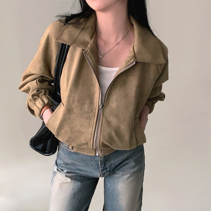 This French-inspired vintage jacket features a classic lapel and a zip-up front, crafted with a suede-like material for a soft, luxurious feel. Its loose fit and long sleeves provide comfort and style, while the short length makes it a versatile piece for layering or pairing with any outfit. Perfect for a chic, timeless look.
