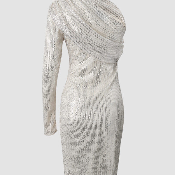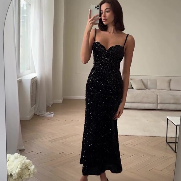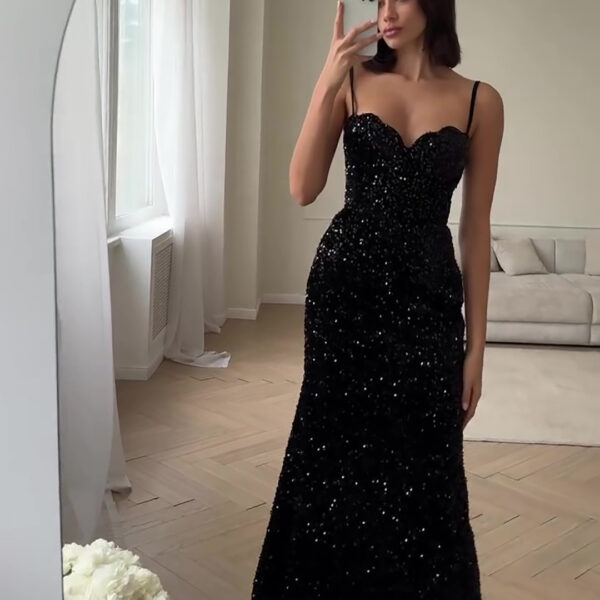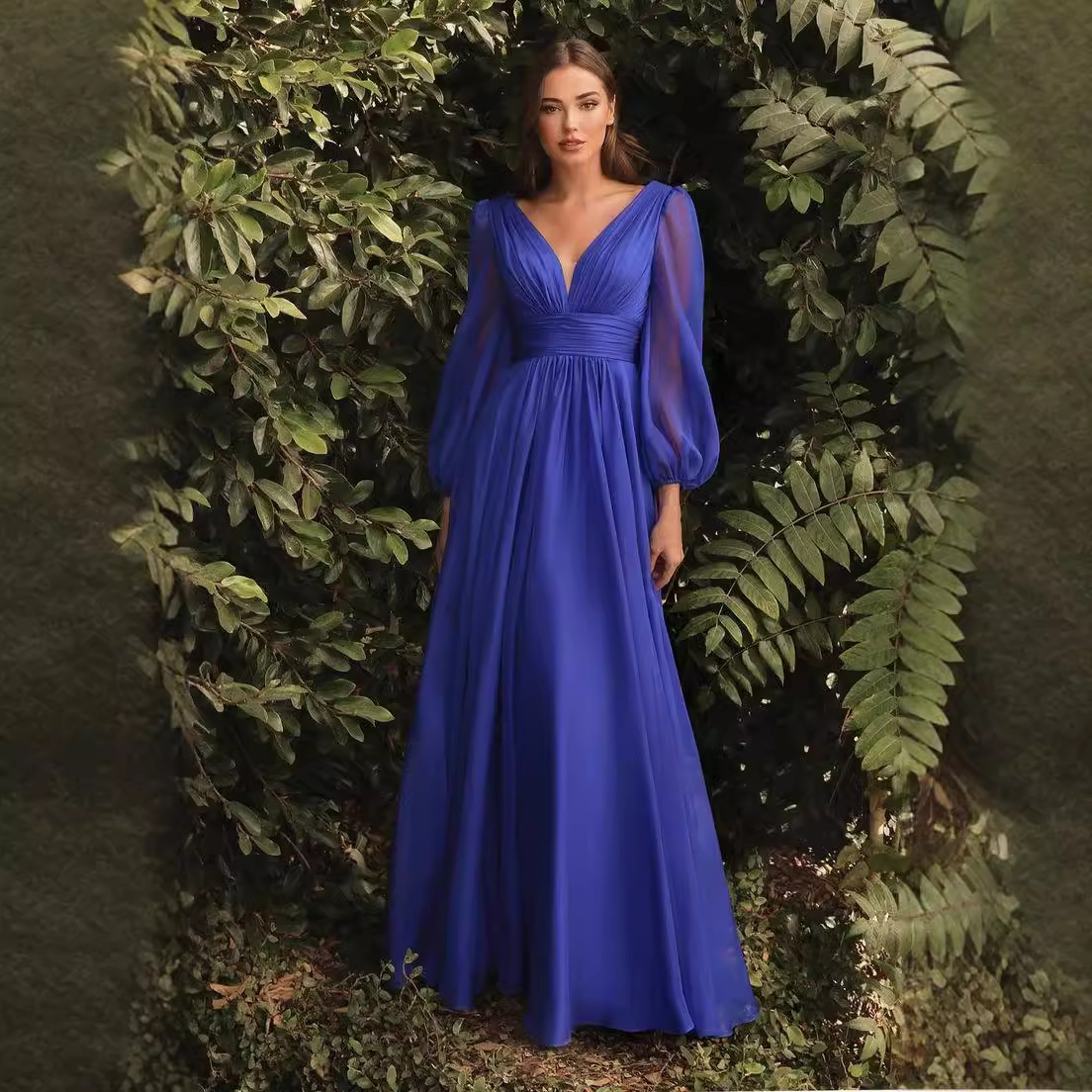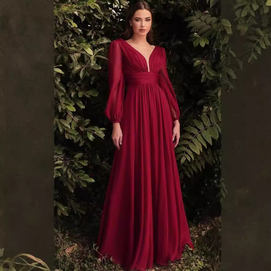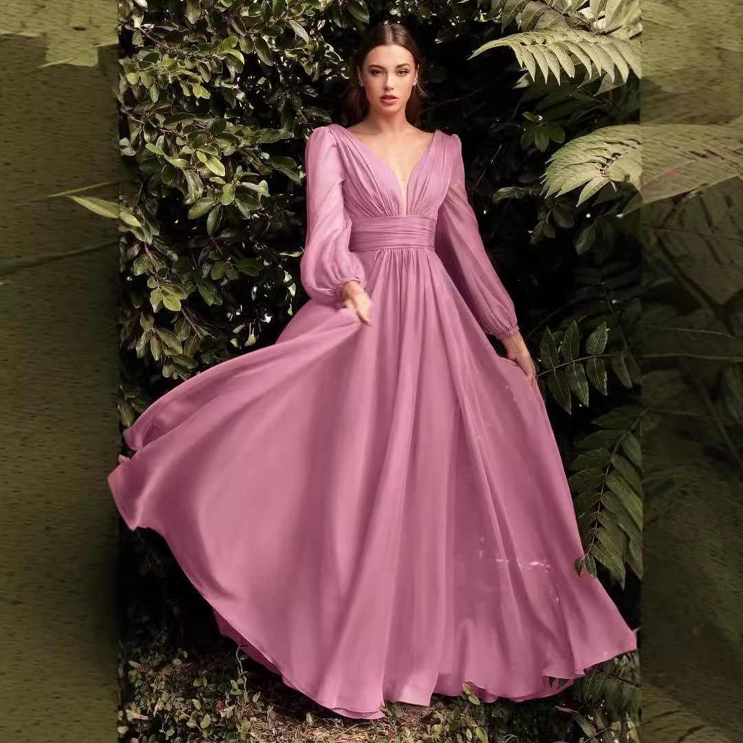 A sexy and elegant deep V-neck dress with long chiffon sleeves, perfect for showcasing sophistication and style. Ideal for formal events or evening outings.