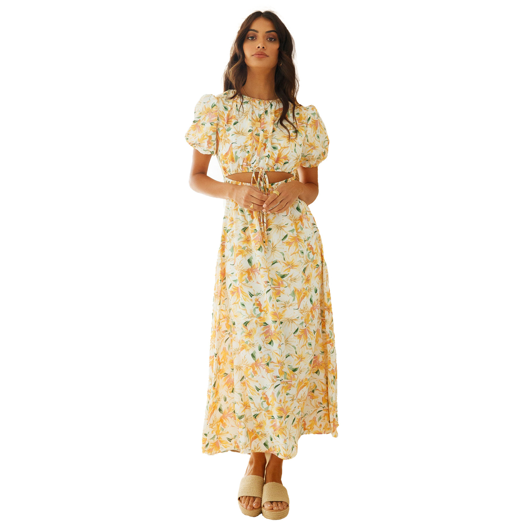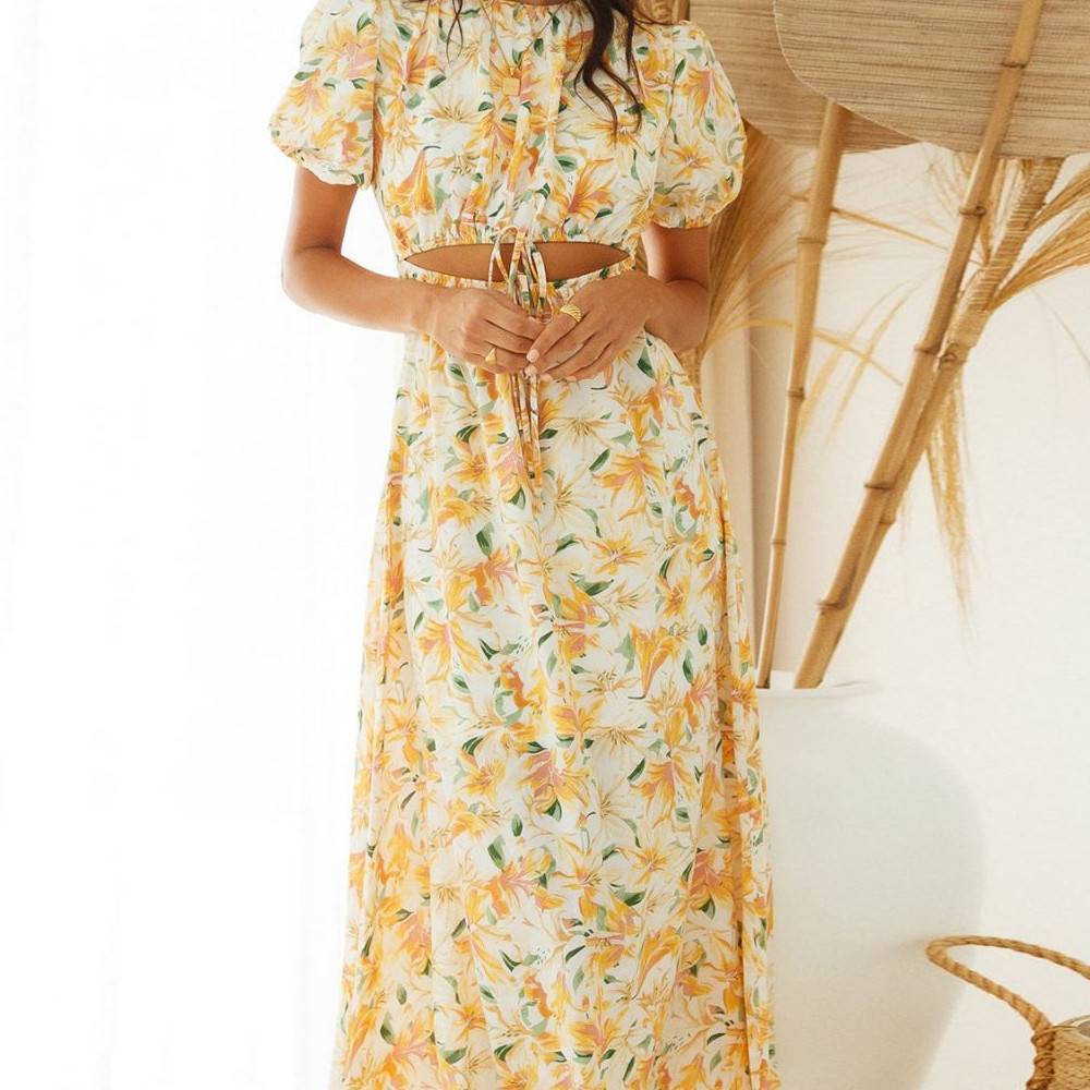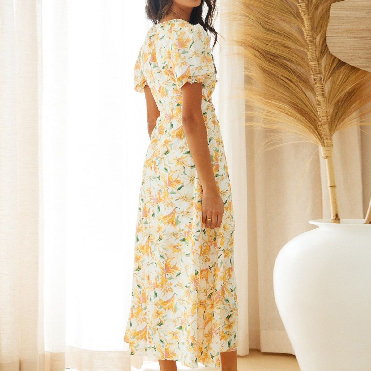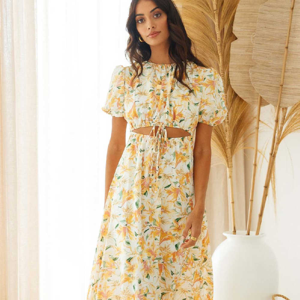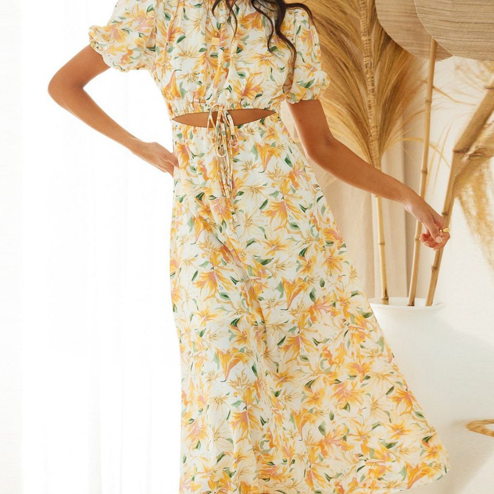 Stay effortlessly stylish in this short-sleeved, crew neck dress with eye-catching prints—perfect for casual days and sunny outings.