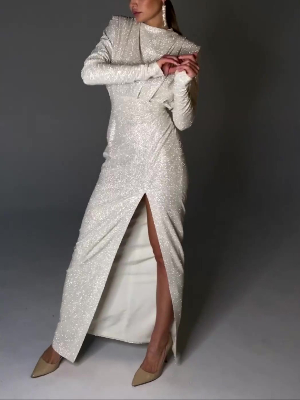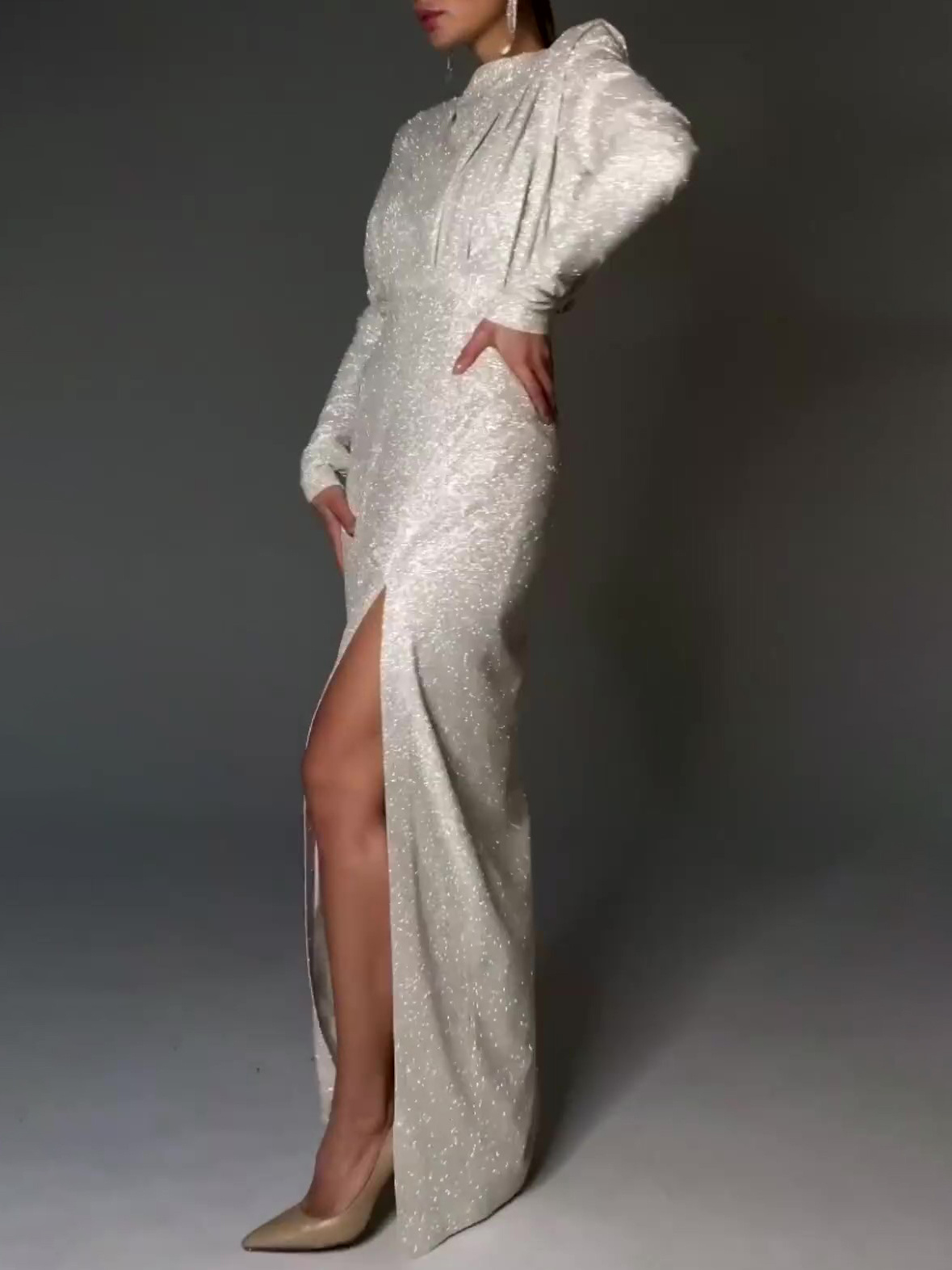 This stunning evening dress features a sleek, shiny fabric and a bold slit, offering a glamorous and sophisticated look for formal events. Perfect for making a statement at any special occasion.