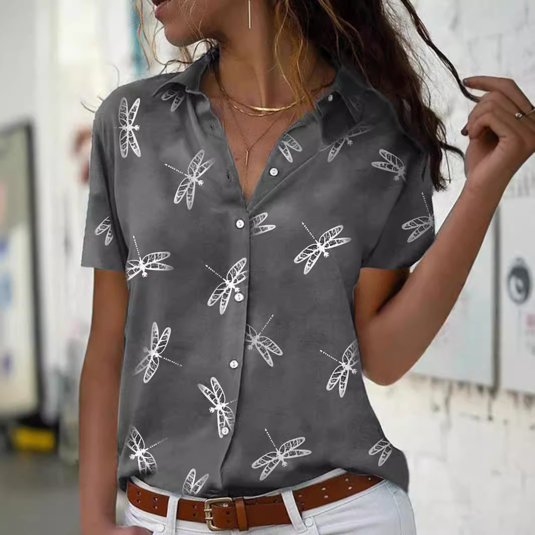 A breezy short sleeve shirt with a vibrant dragonfly and flower print, perfect for summer. Lightweight and stylish, it’s ideal for casual outings or adding a playful touch to your warm-weather wardrobe.