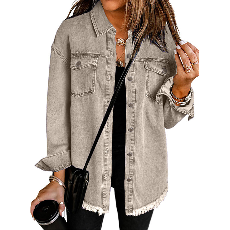 This stylish denim top features a lapel collar, long sleeves, and a single-breasted design. The mid-length cut offers a flattering silhouette, while the solid color adds versatility to any wardrobe. Perfect for casual outings or layering over various outfits.