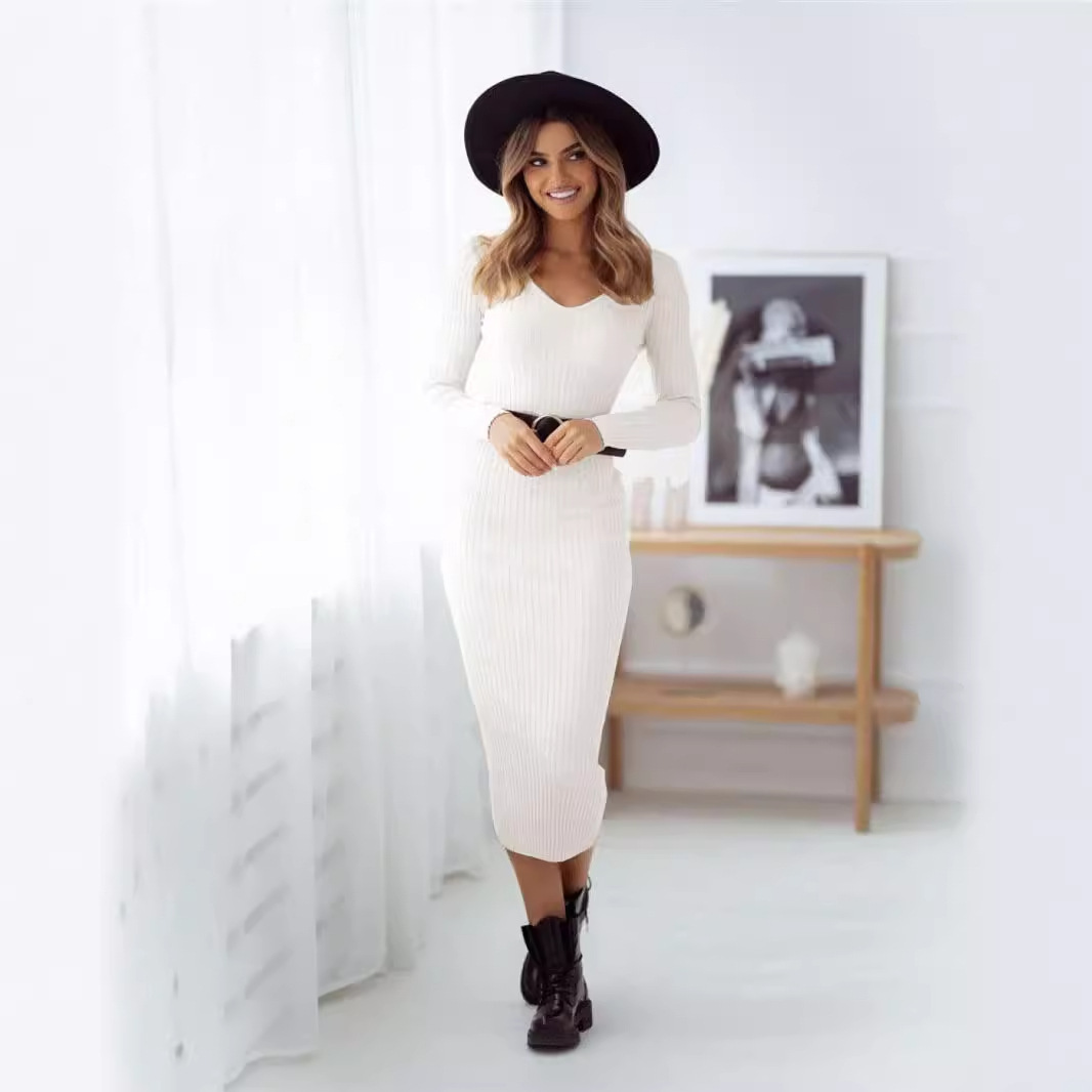 A simple, solid-color midi dress made from soft knit fabric. Comfortable and versatile, perfect for casual wear or layering in cooler weather.